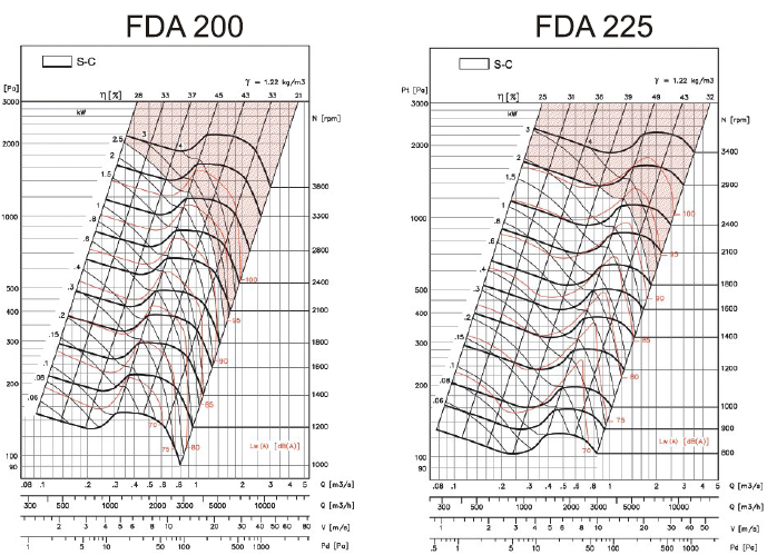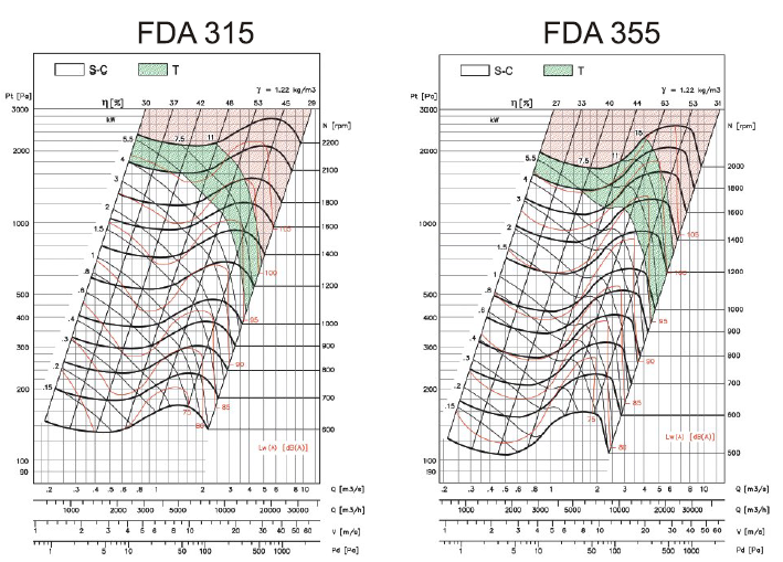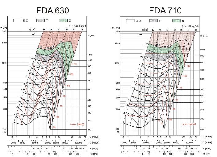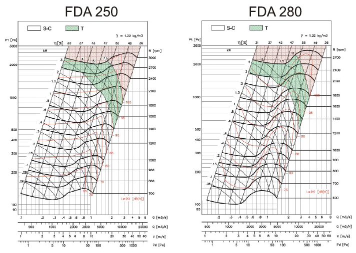 依系統風量、靜壓、噪音等需求可採前傾多翼式或後傾多翼式有殼式風機。