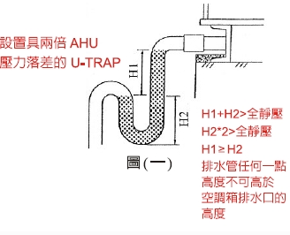 排水管之安裝須製作U-TRAP如圖(一)所示,並使水封之高度大於機內之靜壓值,以免造成排水不良,排水管必須至少保持一定之斜度,以利排水,避免箱體內積水。