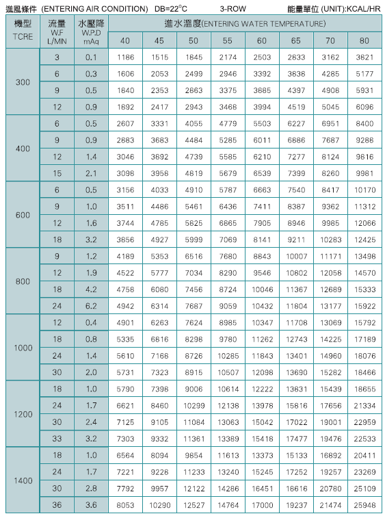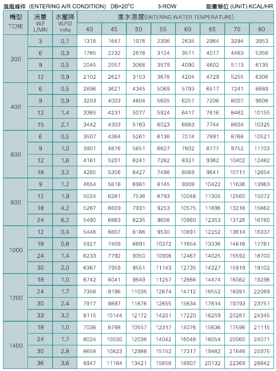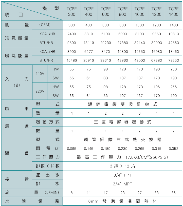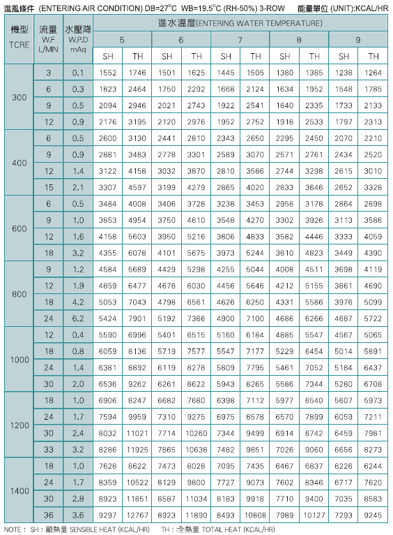 以上冷氣能力是在入風條件DB=27˚C、WB=19.5˚C、入水7˚C、出水12˚C時測得之數據。