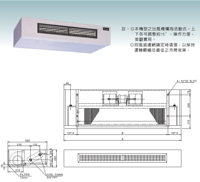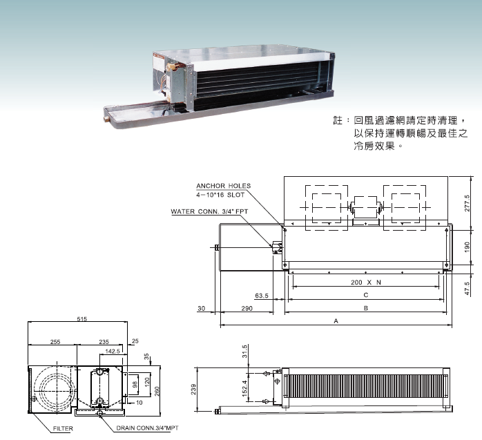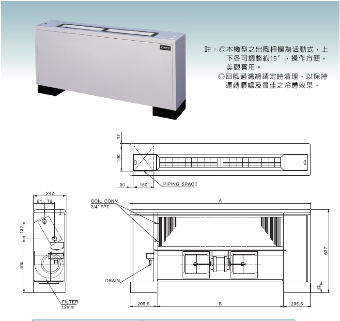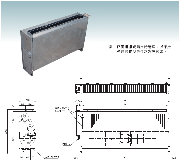盤管:採用日本進口銅管,並經機械漲管,鋁鰭片與銅管絕對緊密結合,熱傳導效果佳。
