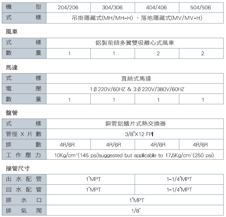 盤管:選用日本原裝進口3/8"無縫紫銅管鋁鰭片式熱交換器,並經精密機械漲管,鋁鰭片與銅管絕對緊密結合,熱交換效果最佳。盤管並依ISO品保系統百分之百經高壓25kg/cm²沈水氣密探漏,品質保證,值得信賴。