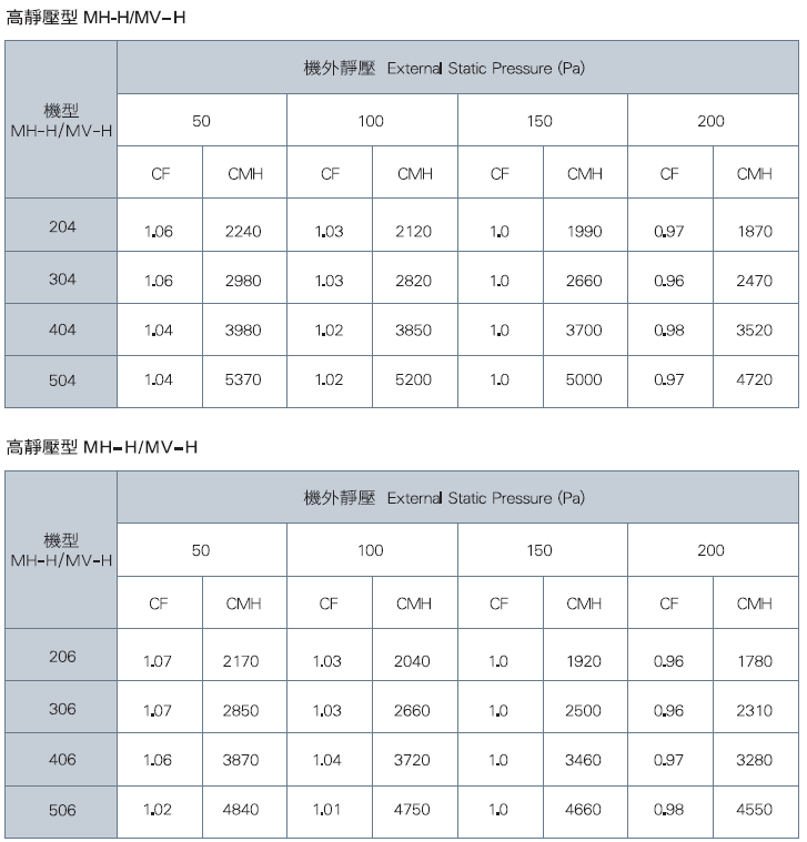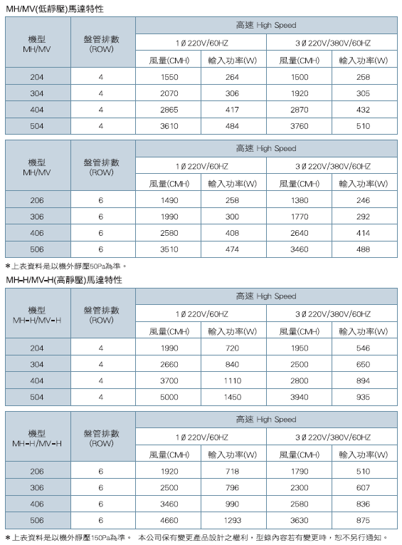 *上表資料是以10 220V機型,機外靜壓150Pa時之能量為基準 (CF-1.0)