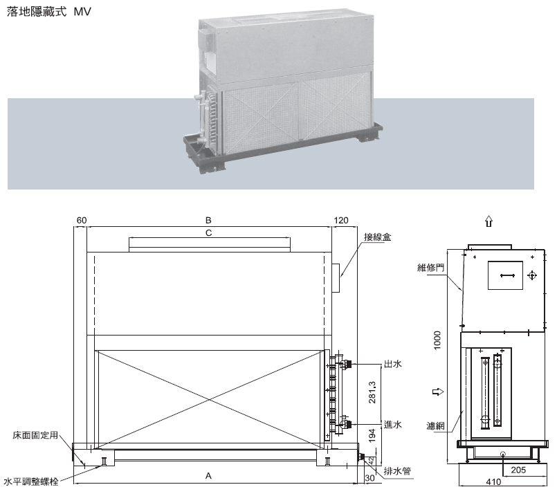 水盤:採用SUS不銹鋼板成型,耐腐蝕、耐氧化、壽命最長,水盤並貼附高密度10mm厚PE保温板,絕無漏水、結露滴水之虞。