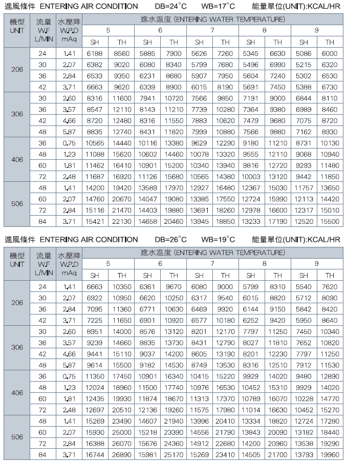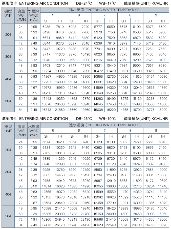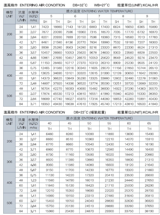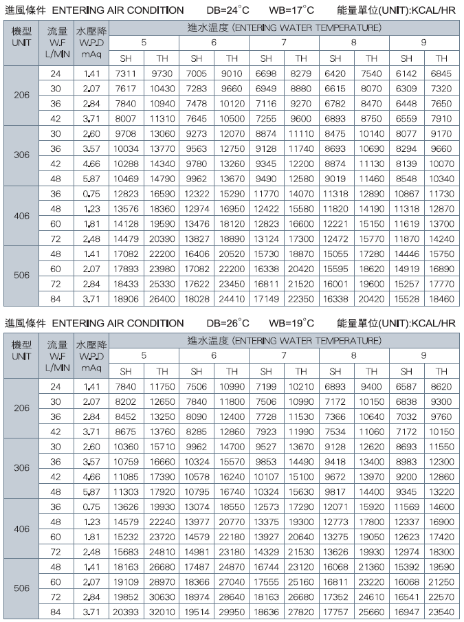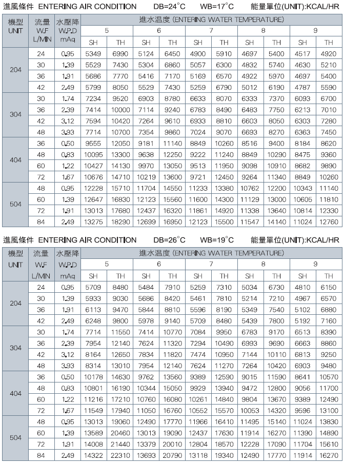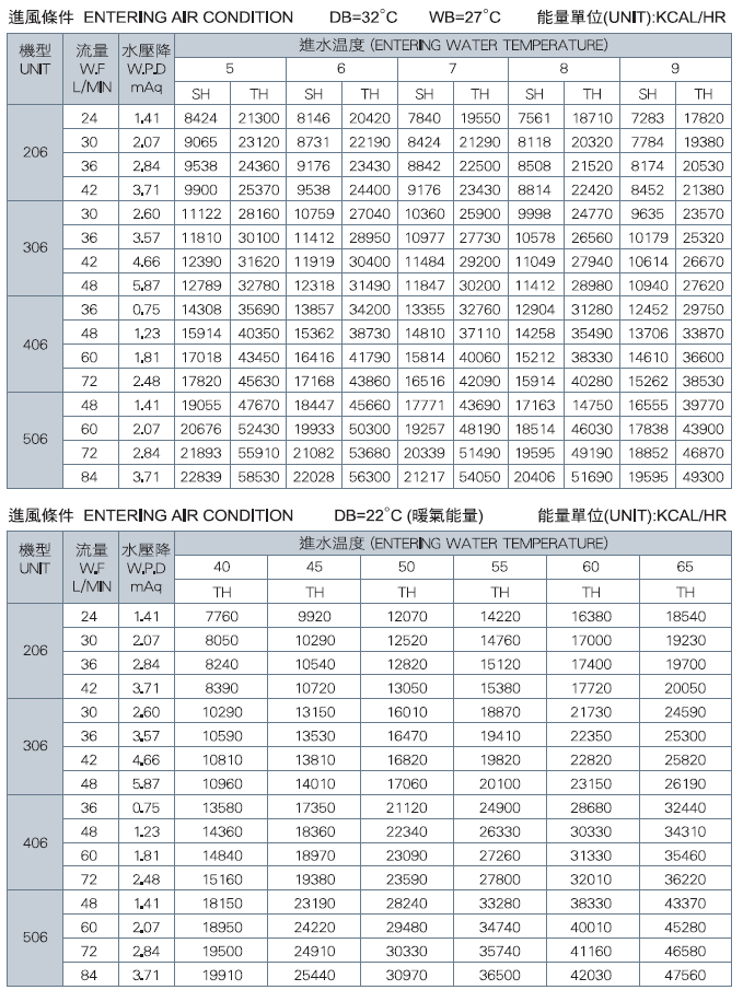 *上表資料是以50Pa ESP為準。 顯熱值(KCAL/HR) SH:Sensible Capacity 總熱值(KCAL/HR)TH :Total Capacity