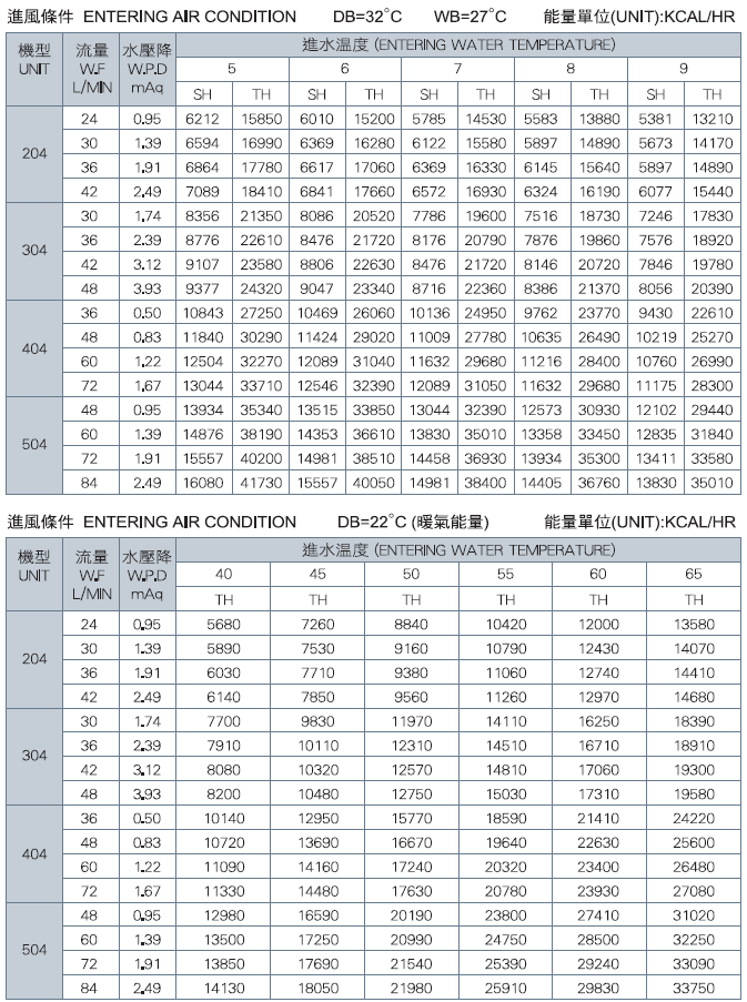 *上表資料是以150Pa ESP為準。 顯熱值(KCAL/HR) SH:Sensible Capacity 總熱值(KCAL/HR)TH :Total Capacity
